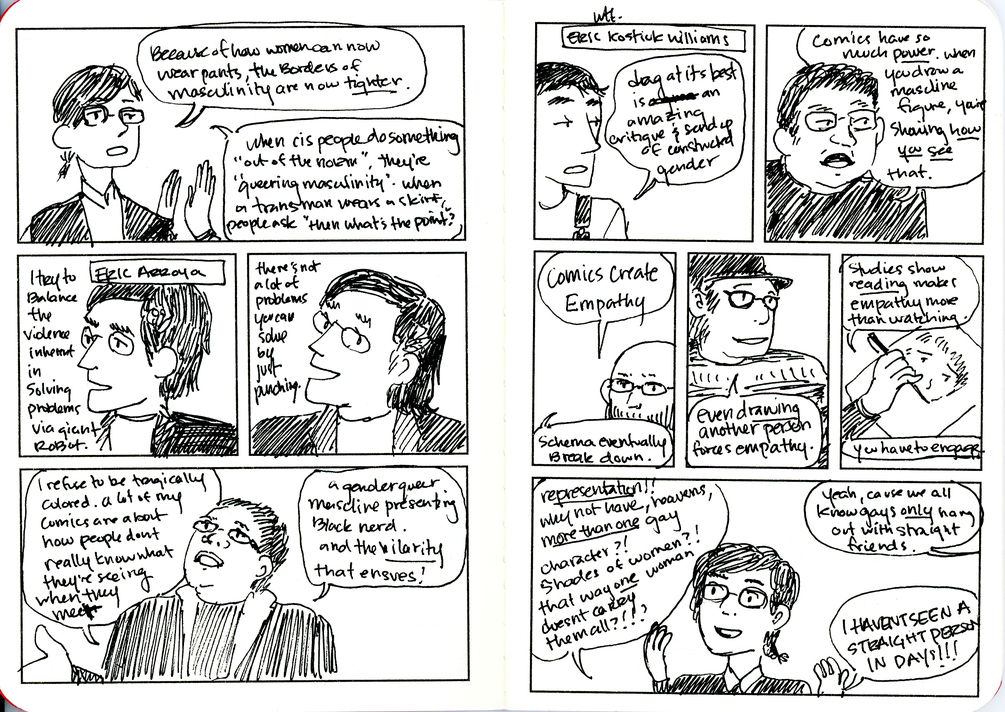 Behold, my comic recap of the 2017 Queers in Comics conference in San Francisco. I scribbled these pages in a pre-boxed 3x5 notebook as people spoke, but what they lack in artistic flair I hope they'll make up for in wisdom nuggets!